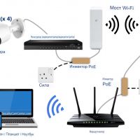 Схема видеонаблюдения: IP-камеры, инжекторы PoE, мосты WiFi, маршрутизатор и видеорегистратор