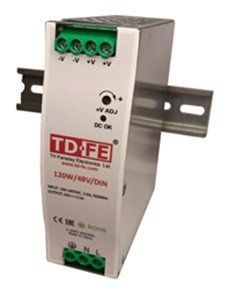 Промышленный блок питания; DC 48, 2.5 А, 120 Вт. Регулировка выходного напряжения в диапазоне 47-54 В; защита от КЗ и перегрузки; монтаж на DIN-рейку; -25…+60°C; 40х114х126 мм.