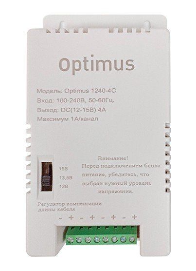 Источник питания стабилизированный; U-вх.100…240 В, U-вых.12…15 В DC (регулировка), I-ном.4 А (4 выхода х 1 А), U-пульс.150 мВ; защита от перегрузок по току и короткого замыкания, винтовые клеммники; IP54, t-раб.-20…+45°С, 144×80×33 мм. Пластиковый корпус.