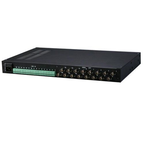 Актив. 16-и канальный блок приема видеосигналов для 19" стойки, 1U. Работает с любым типом кабеля, с любым типом передатчика. Дальность при актив. передатчиках до 2500 м., при пассив. до 1500 м. Допол. защита по каждому каналу. Вход под клеммы, выход 16 BNC. 140-250 В АС