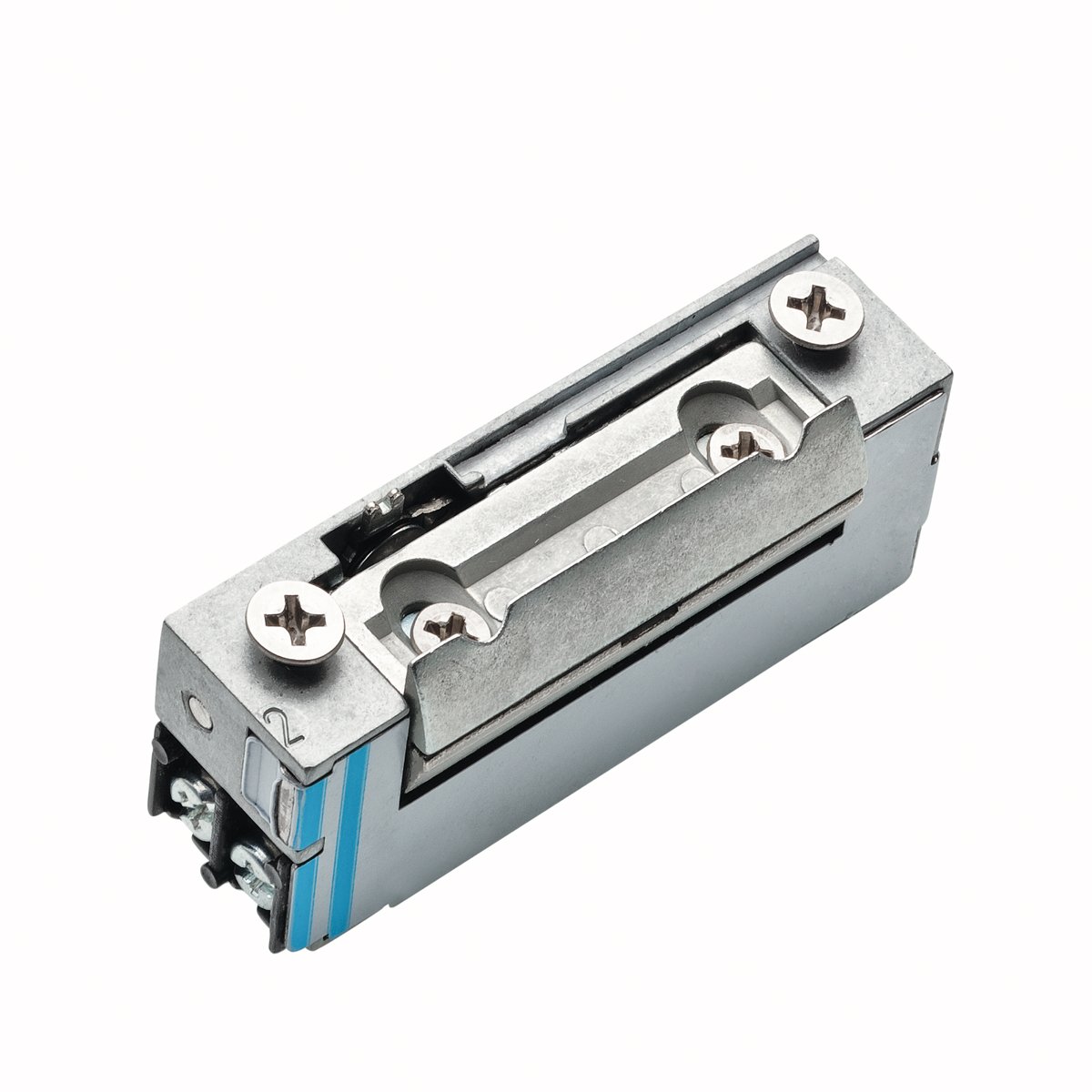 Электрозащелка компактного дизайна с регулируемым радиусным язычком, для дверей с притвором и без. Симметричная. 10-24 V AC/DC, НЗ.