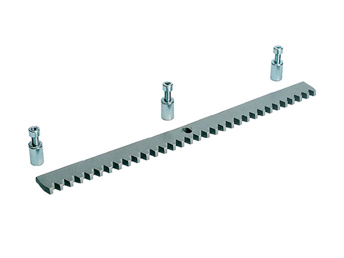 Рейка зубчатая 1 м, модуль 4 из оцинкованной стали 30 x 12 мм с отверстиями и втулками для крепления. Для ворот весом свыше 1 тонны.