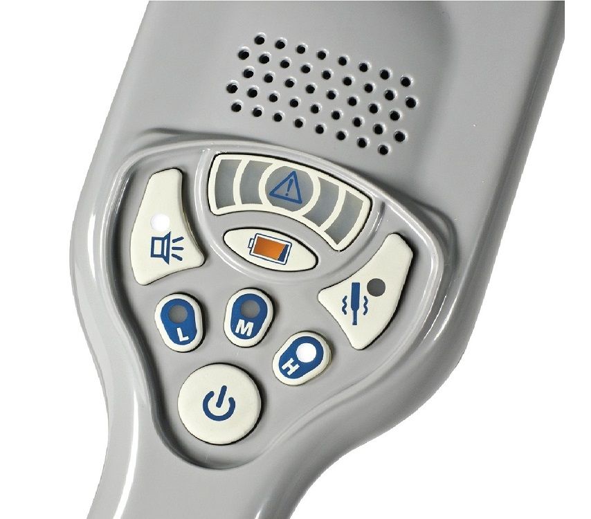 Ручной металлоискатель CEIA PD140e предельно прост в настройке и эксплуатации. Кнопки для включения/выключения, настройки чувствительности и регулировки сигнала тревоги расположены на корпусе прибора. Дополнительно производитель предусмотрел на панели управления индикатор заряда батареи и световой индикатор, который сигнализирует о тревоге и отражает размеры выявленного металлического предмета.