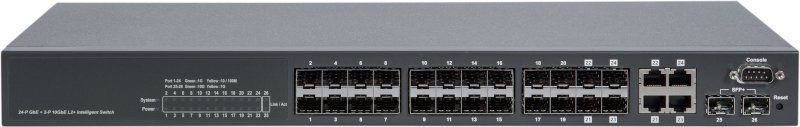 Коммутатор управляемый L3; 20хSFP порта 100/1000 Мбит/с; 4xCombo TP/SFP порта 100/1000; 4 4 10G SFP+; VLAN, IGMP snooping, QoS; консольный порт RS-232C; 8K MAC-адресов; AC 100-240 В; 60Вт; 0…+50 °С; 440х172х44 мм.