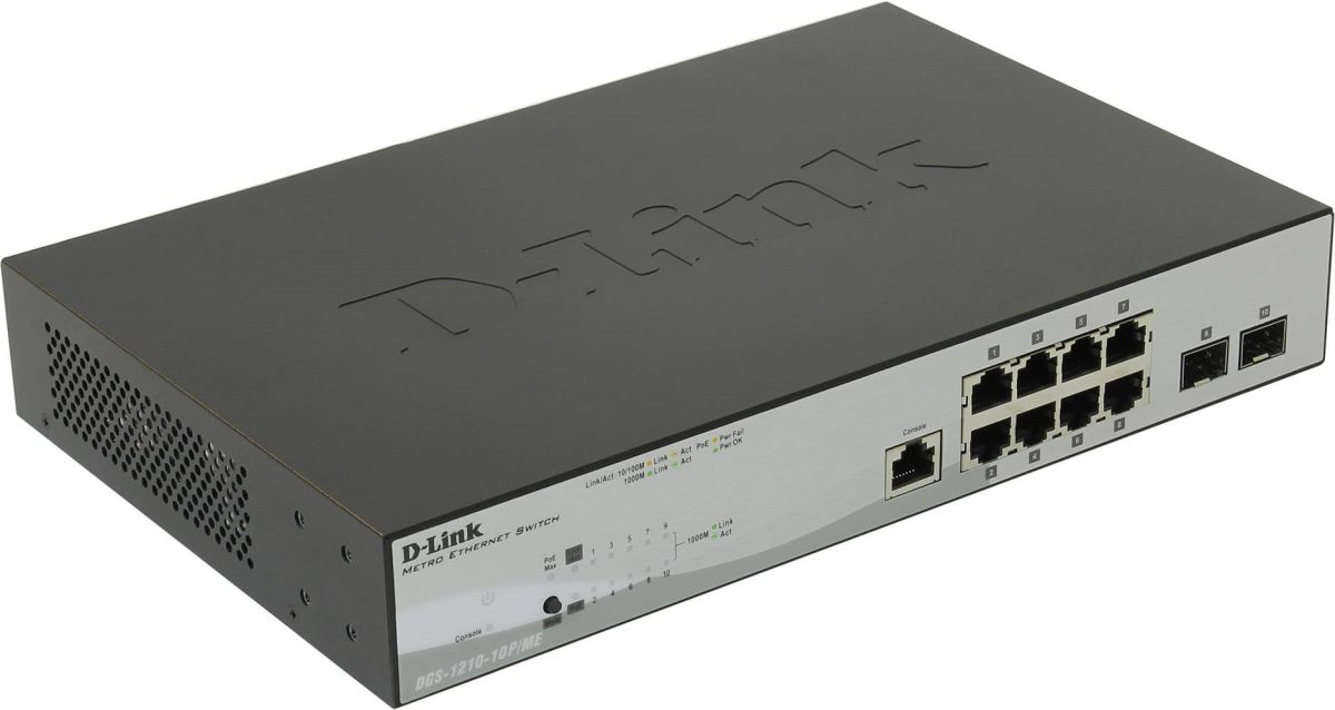 Коммутатор сетевой гигабитный управляемый L2 10 портовый с РОЕ; 8 портов RJ45 РОЕ 10/100/1000 Мбит/с(af/at); 2 портa SFP 1000 Мбит/с; Console порт; РОЕ бюджет 78Вт; АC 100-240В; 5…+50°C; 280х126х44 мм.