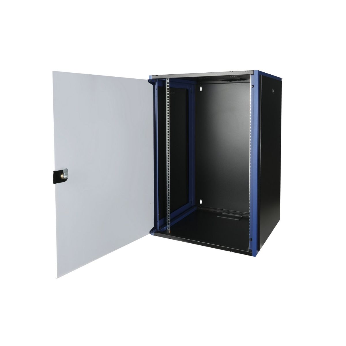 Шкаф телекоммуникационный 19" настенный, 18U, передняя дверь с тонированным ударопрочным стеклом, задняя стенка сплошная цельнометаллическая, 861х600х450 мм (ВхШхГ), полезная глубина 434мм, распределенная нагрузка: 50 кг, в комплект поставки входит: комплект крепежа для сборки; щеточный кабельный ввод, черный RAL 9005, IP20.
