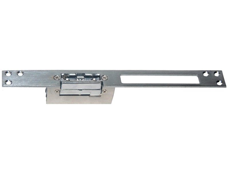 Электромеханическая защелка, нормально открытая (НО), 250mA, 12В (DC), сила удержания 400кг, материал: сталь с покрытием. Накладка в комплекте, защелка: 75х19х33мм, накладка: 250x25x3мм, 270 гр.