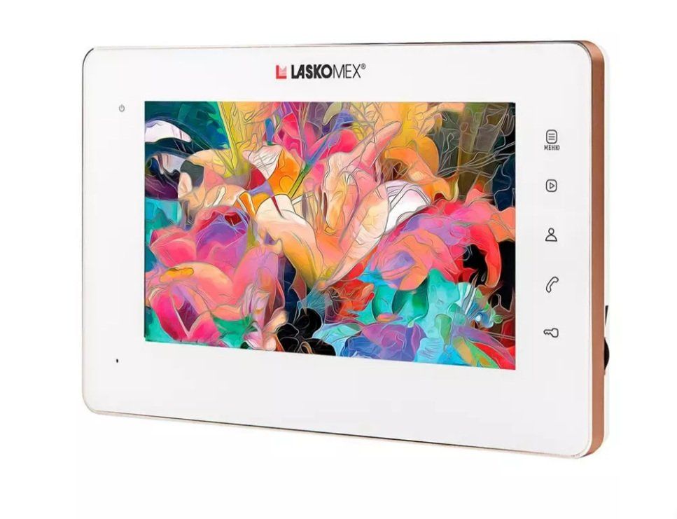 Монитор видеодомофона TFT, цветной, 7 дюймов, 800x480, сенсорные кнопки. Подключение любого подъездного домофона, цифрового или координатного, 2-х вызывных панелей или видеокамер. Совместимость с большинством моделей отечественных вызывных панелей. 100-240 В, 135х210х19 мм. Цвет корпуса: белый с золотой алюминиевой рамкой. Регулировка громкости переговоров с этажной вызывной панелью.