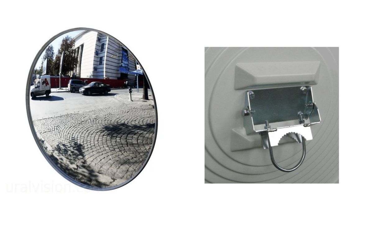 Зеркало круглое уличное, диаметр зеркала 900 мм, радиус выпуклости 2050 мм, h выпуклости 48,8 мм, комбинированное расстояние 34 м. Крепление под трубу Ø 57-76мм; угол наклона ± 35-40°.