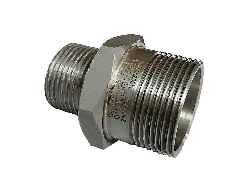 Переходник с внешней резьбы М16х1.5 на внешнюю резьбу М20х1.5, взрывозащищенный 1Ex db IIC Gb, PB Ex db I Mb, 1Ex e IIC Gb, 2Ex nR IIC Gc, Ex tb IIIC Db, РП Ex e I Mc, как Ех-компоненты - Ex db IIC Gb U, Ex db I Mb U, Ex e IIC Gb U, Ex nR IIC Gc U, Ex tb IIIC Db U, Ex e I Mc U; IP66/ IP68; длина резьбы 10 мм, размер под ключ 22 мм; IP66/ IP68, t-раб. -75...+250 °С. Нержавеющая сталь.