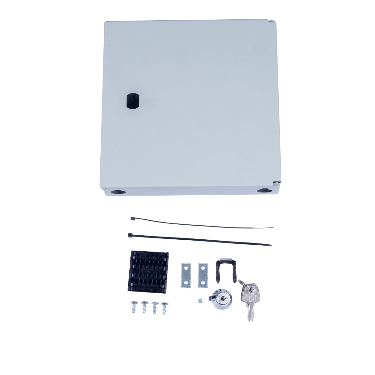 Кросс оптический настенный, до 8 SC/Duplex LC портов, стальной, серый, с ложементом, дверка с замком, сплошная панель внутренняя, 184х184х45 мм.