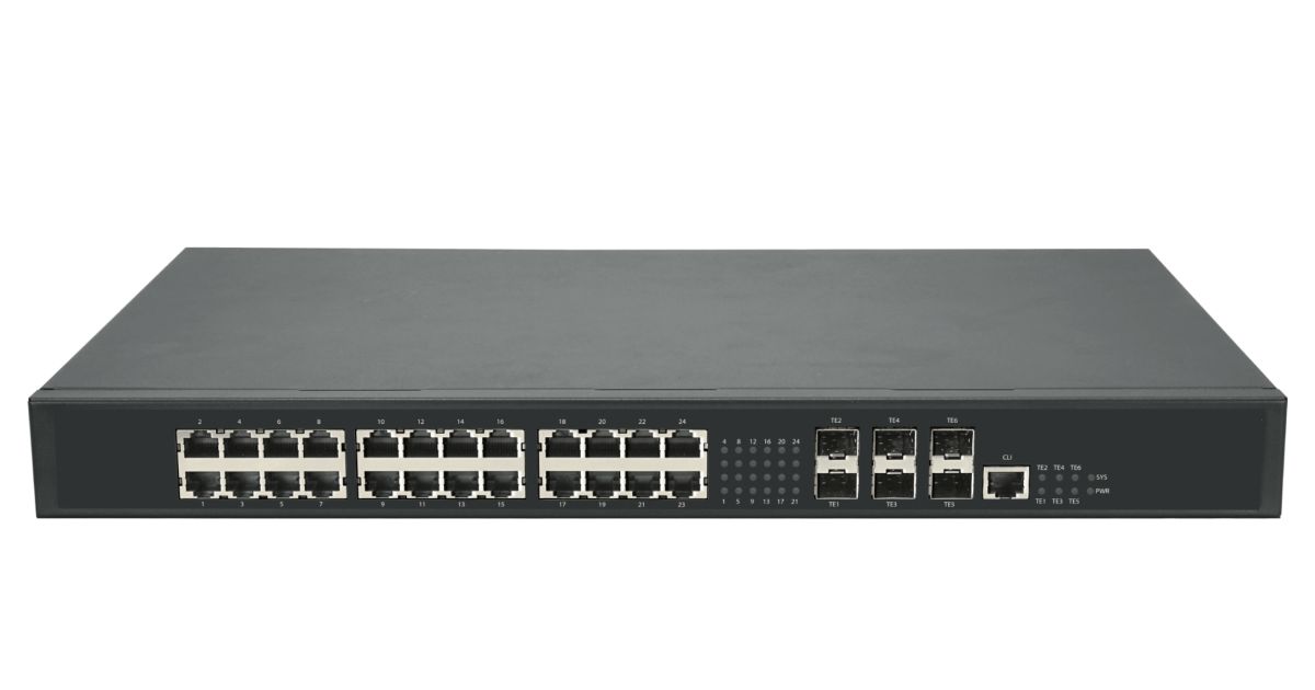Коммутатор сетевой управляемый L3 на 30 портов, гигабитный: 24хRJ45 - 2.5 Гбит/с; 6хSFP+ 10 Гбит/с, порт CONSOLE, монтаж в 19" стойку 1U, крепление в комплекте, AC 100-240 В, 50Вт; IP30; 0…+55 °С; 440х210х44 мм.
