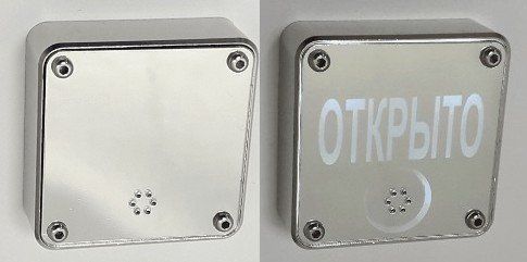 Светозвуковой оповещатель "ОТКРЫТО", для применения в составе СКУД; светодиодная подсветка, U-пит. 12 В, I-потр. ≤40 мА; t-раб.-25…+50°C, уличное, влагозащищенное исполнение; габ.размеры 40х40х12 мм; анодированный алюминиевый сплав, акрил. Цвет "зеркальный хром".
