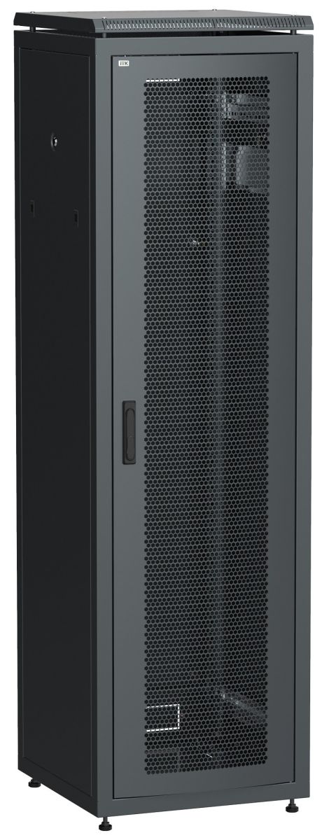 Шкаф телекоммуникационный 19", напольный, 42U, 2055x600х600 мм (ВхШхГ), полезная глубина 515 мм, передняя дверь перфорированная, задняя дверь – глухая металлическая; ручка с замком; распределенная нагрузка: 1000 кг; цвет черный (RAL 9005).