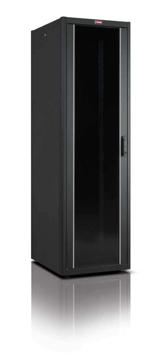 Шкаф напольный 19", 36U, допустимая статическая нагрузка 600 кг, 2010x600х600 мм. Передняя дверь стеклянная с поворотной ручной и замком. Цвет черный.