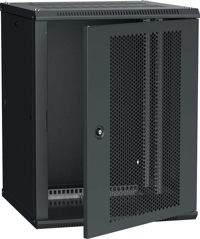 Шкаф телекоммуникационный 19" настенный, дверь перфорированная, 12U, 635х600х600 мм (ВхШхГ), полезная глубина 500 мм, распределенная нагрузка: 90 кг; IK10; цвет чёрный.