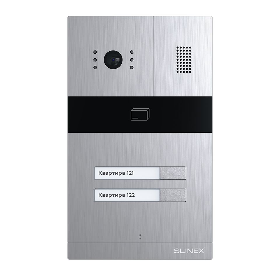 AHD вызывная видеопанель на 2 абонента со встроенным контроллером и комбинированным считывателем бесконтактных карт. Цветная матрица CMOS, разрешение 2,0 Мп (AHD)/1 Мп (AHD)/960 ТВЛ (CVBS), угол обзора: 115° по горизонтали, минимальная освещенность: 0,01 Люкс (ИК подсветка до 1,5 м). Кнопка переключение режима камеры. Механический ИК фильтр, подсветка кнопок. Встроенный считыватель карт: EM-Marin и Mifare. Количество идентификаторов: 248 шт. Выход Wiegand-26. НО/НЗ контакт реле, IP65, -40...+65°C, +12 В (от монитора), 110х186х32 мм. Врезная установка. Цвет: серебро.
