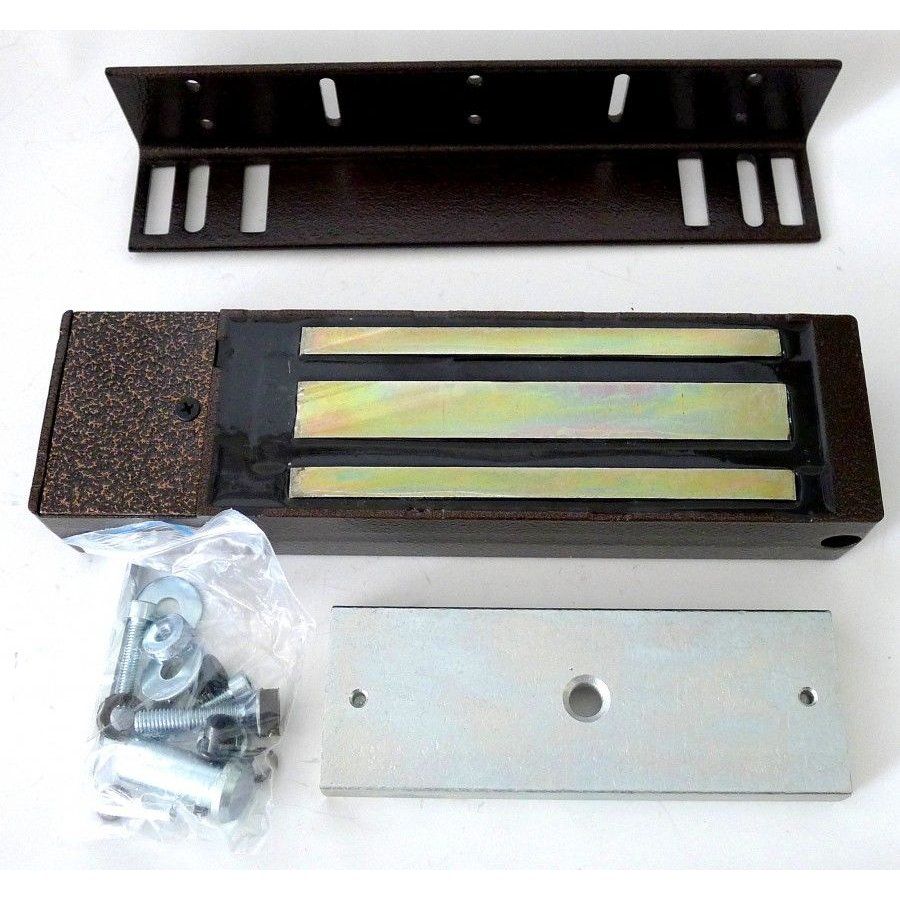 Сила удержания 500 кг, 12 В, 0,65 A, -30…+50 °С, 270x75x45 мм, 5600 г. Встроенная плата временной задержки замка (1-15 сек), тип кнопки НО, световая и звуковая индикация, схема перемагничивания, механический компенсатор эффекта остаточной намагниченности на якоре замка. Уголок в комплекте. Цвет коричневый.