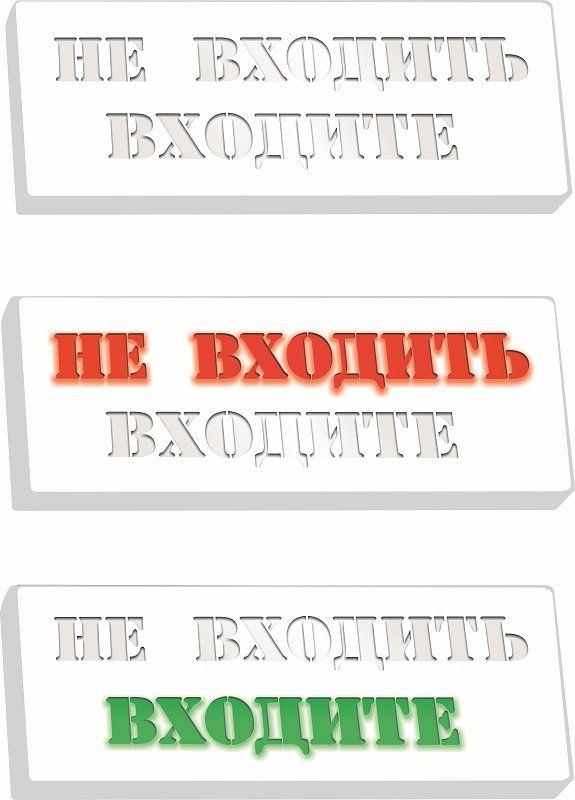 Подсвечивание непрерывным красным цветом предупреждающей надписи «НЕ ВХОДИТЬ» и мигающим зеленым цветом разрешающей надписи «ВХОДИТЕ». Для совместной работы с проводными кнопками MP-421D1 и радиокнопками MP-411D1, а также с пультом GC-4001DG в составе комплекта вызова «HostCall MP-912W2». Дополнительно к светозвуковому табло MP-740R2 можно подключить две сигнальные лампы MP-611W1 и одно такое же светозвуковое табло.