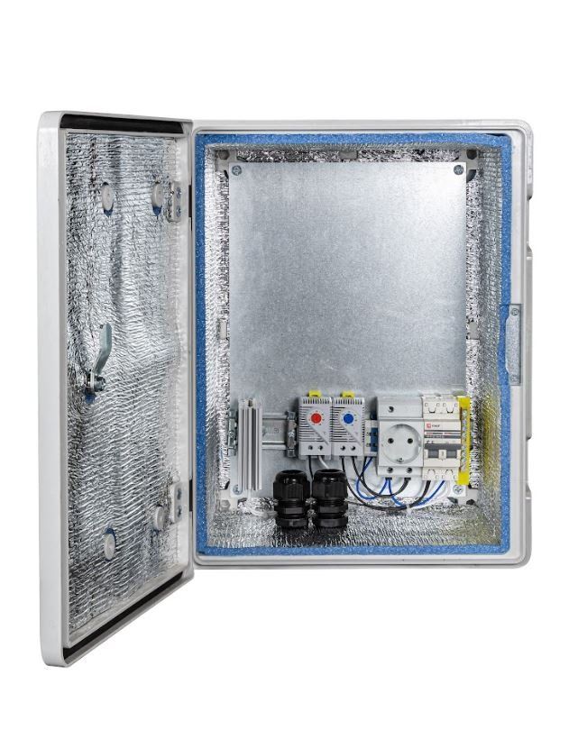 Шкаф монтажный с монтажной платой; 2 гермоввода; внутренние размеры 290х390х190 мм (ШхВхГ); t-раб.-55…+50°С, 335х417х200 мм (ШхВхГ), 5.0 кг. Цвет серый. Комплектация: утеплитель из Порилекса, замок 1 шт, ключ 1 шт, розетка 1 шт, автоматический выключатель 1 шт, термореле 1 шт., реле предстарта 1 шт., нагреватель мощностью в 50 Вт 1 шт.
