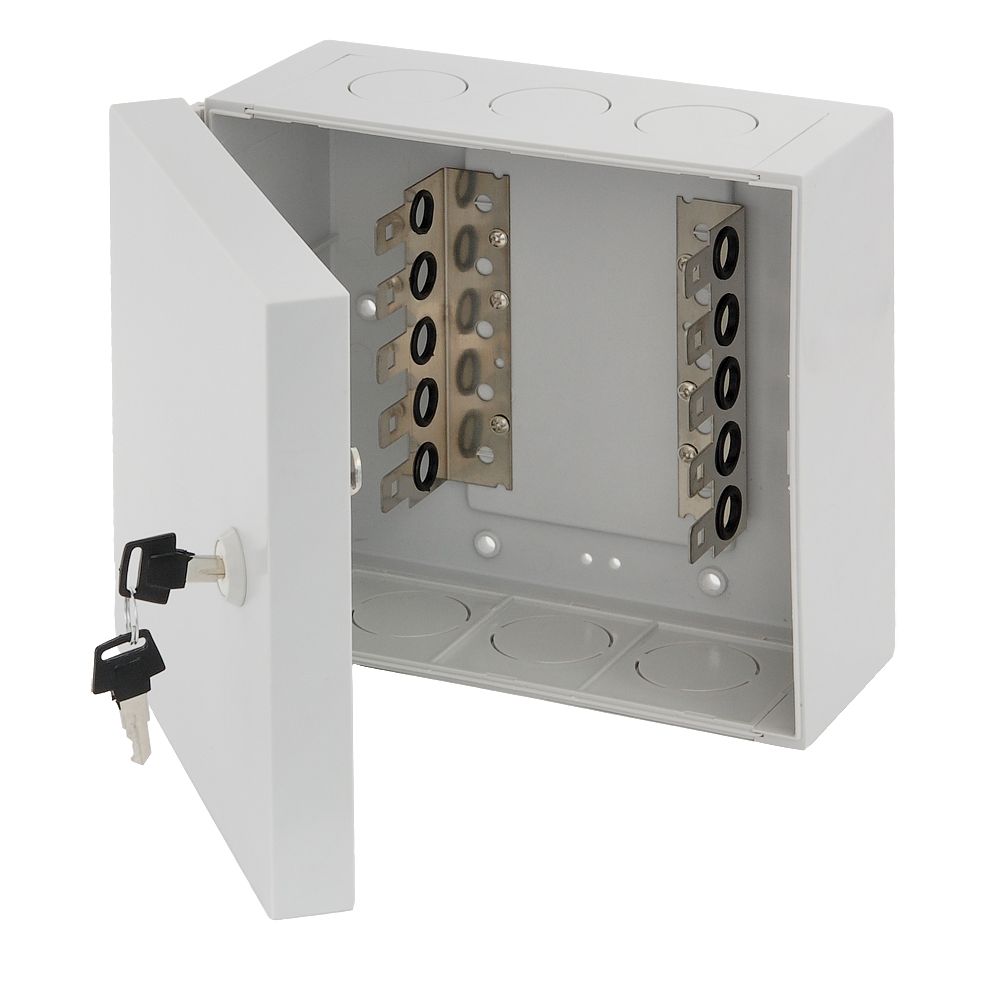 Бокс настенный распределительный, на 5 плинтов (до 50-ти пар), с кронштейнами, пластиковый, с замком, 188х210х105мм, серый.