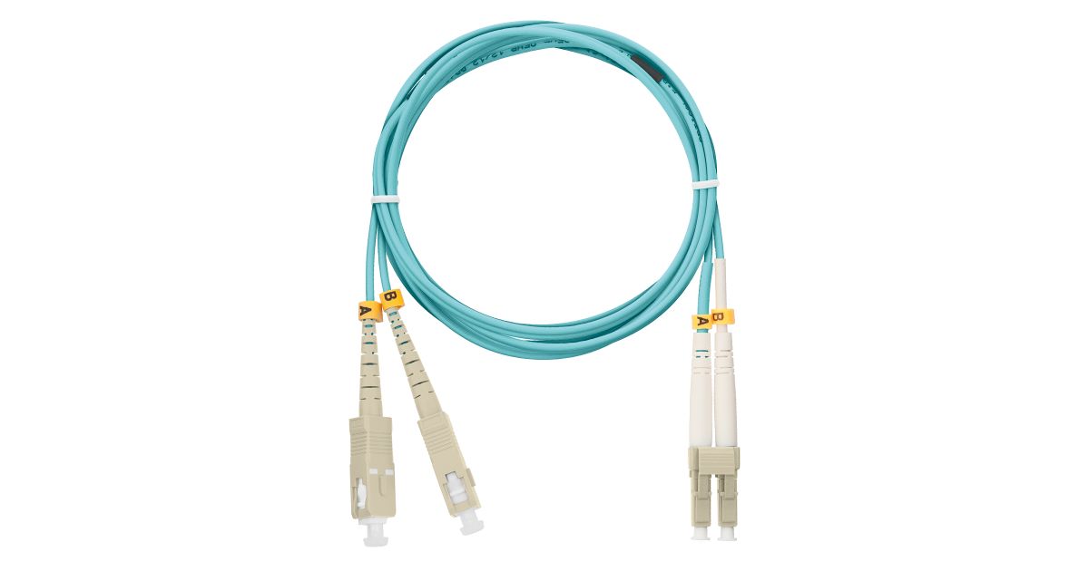 Шнур волоконно-оптический, многомодовый 50/125мкм, стандарта ОМ3, SC/UPC-LC/UPC, двойной, LSZH нг(В)-HFLTx, 2мм, аква, 5м.