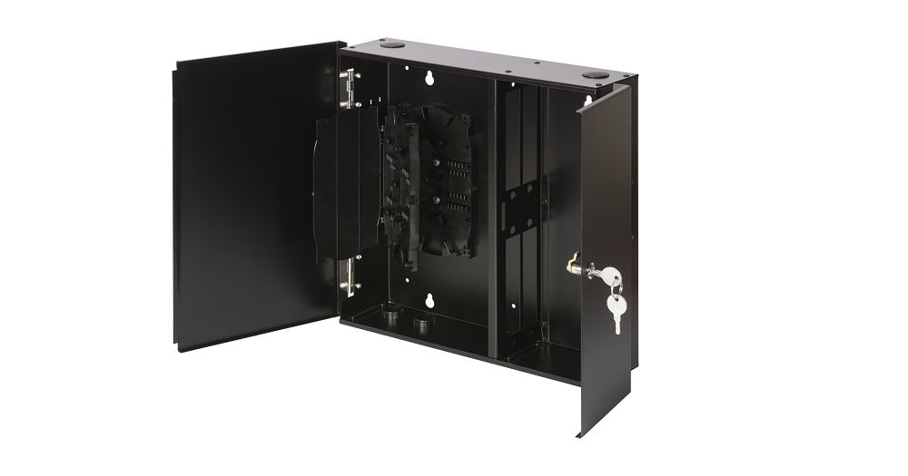 Оптический кросс настенный, до 48 SC/LC портов или 24 FC/ST портов, стальной, с ключом, черный, в комплекте: сплайс-кассета и КДЗС.