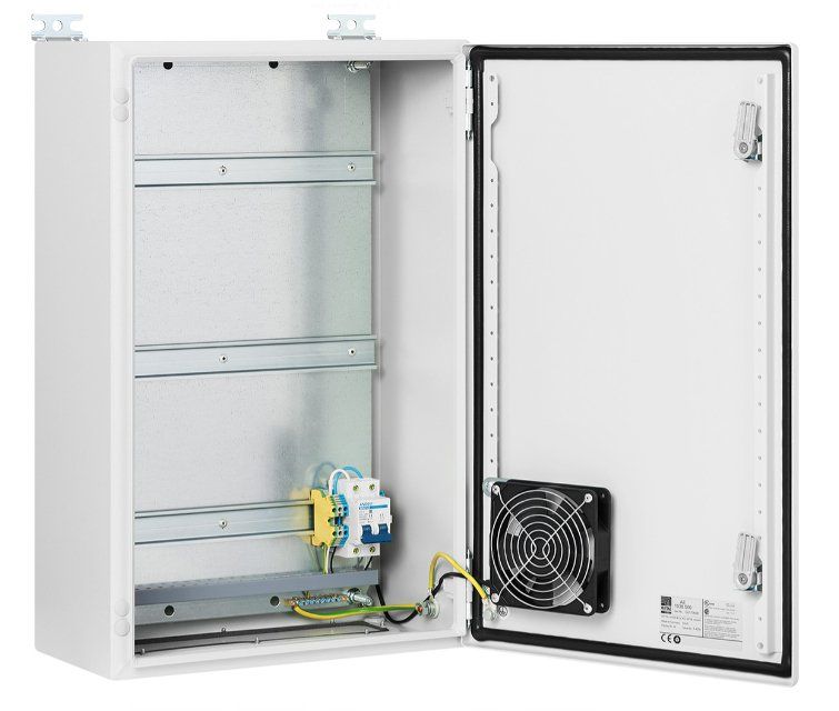 Шкаф монтажный всепогодный из листовой стали с порошковым покрытием, с монтажной панелью с DIN-рейками для клиентского оборудования, комплект [1] (с вентилятором); U-пит.100...240В; IP66, t-раб.-40...+60°С, 380x600x210 мм. В комплекте гермовводы, проходные клеммы, двухполюсный автомат (10 А), шина заземления, вентилятор с термостатом.