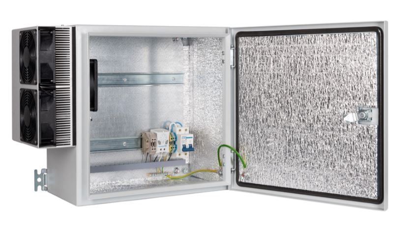 Шкаф монтажный всепогодный из листовой стали с порошковым покрытием, с монтажной панелью с DIN-рейками для клиентского оборудования, комплект [1,4,5] (с вентилятором и охладителем); U-пит.100...240В; IP66, t-раб.-40...+60°С, 400x400x230 мм. В комплекте гермовводы, проходные клеммы, двухполюсный автомат (10 А), шина заземления, вентилятор с термостатом, термоэлектрический охладитель FR-208-AC. Теплоизоляция из вспененного полиэтилена ПЕНОФОЛ.