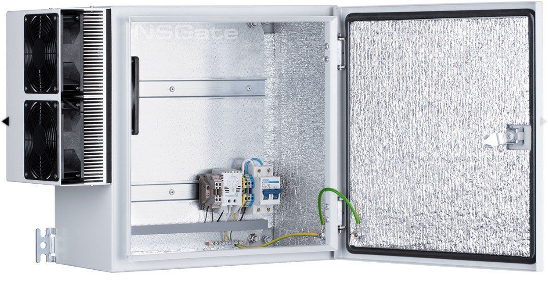 Монтажный шкаф, листовая сталь с порошковым покрытием, DIN-рейка; гермовводы; автомат 10A; клеммы проходные; вентилятор с термостатом, оптический кросс, 400x400x230 мм.
