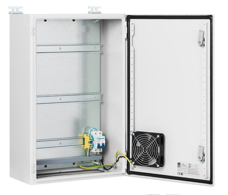 Шкаф монтажный всепогодный из листовой стали с порошковым покрытием, с монтажной панелью с DIN-рейками для клиентского оборудования, комплект [1] (с вентилятором); U-пит.100...240В; IP66, t-раб.-40...+60°С, 400x400x230 мм. В комплекте гермовводы, проходные клеммы, двухполюсный автомат (10 А), шина заземления, вентилятор с термостатом.