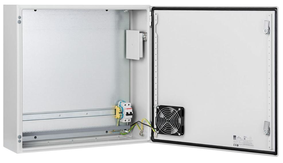 Шкаф монтажный всепогодный из листовой стали с порошковым покрытием, с монтажной панелью с DIN-рейками для клиентского оборудования, комплект [1,3] (с вентилятором и ODF); U-пит.100...240В; IP66, t-раб.-40...+60°С, 600x600x210 мм. В комплекте гермовводы, проходные клеммы, двухполюсный автомат (10 А), шина заземления, вентилятор с термостатом, оптический кросс на 4 FC адаптера.