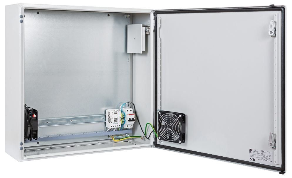Шкаф монтажный всепогодный из листовой стали с порошковым покрытием, с монтажной панелью с DIN-рейками для клиентского оборудования, комплект [1,2,3] (с вентилятором, нагревателем и ODF); U-пит.100...240В, P-потр.100 Вт; IP66, t-раб.-40...+60°С, 600x600x210 мм. В комплекте гермовводы, проходные клеммы, двухполюсный автомат (10 А), шина заземления, вентилятор с термостатом, нагреватель с термостатом, оптический кросс на 4 FC адаптера.