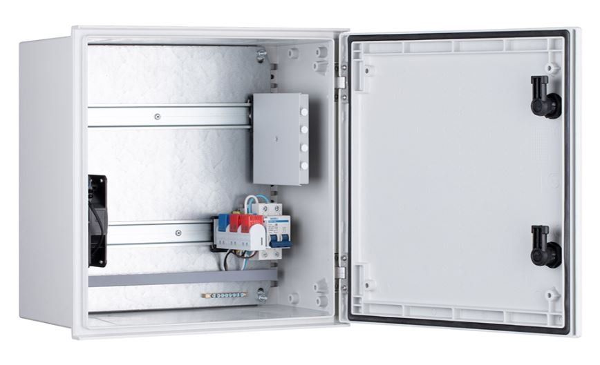 Шкаф монтажный всепогодный из армированного стекловолокном полиэстера, с монтажной панелью с DIN-рейками для клиентского оборудования, комплект [1,2,3] (с вентилятором, нагревателем и ODF); U-пит.100...240В, P-потр.100 Вт; IP66, t-раб.-40...+60°С, 400x400x200 мм. В комплекте гермовводы, проходные клеммы, двухполюсный автомат (10 А), шина заземления, вентилятор с термостатом, нагреватель с термостатом, оптический кросс на 4 FC адаптера.