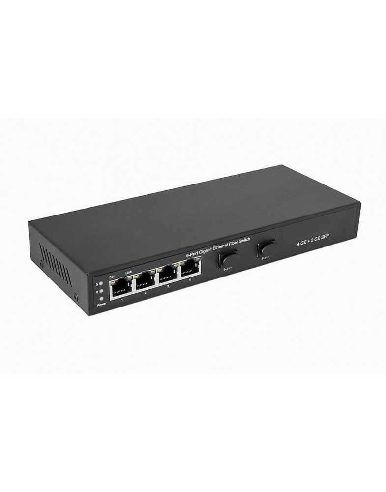Коммутатор сетевой гигабитный 6 портовый; 4хRJ45 10/100/1000 Мбит/с; 2хSFP Uplink 1000 Мбит/с; внутренний БП DC 12В, 1А в комплекте; грозозащита 3кВ; +10... +55°C; 210x28x85 мм.