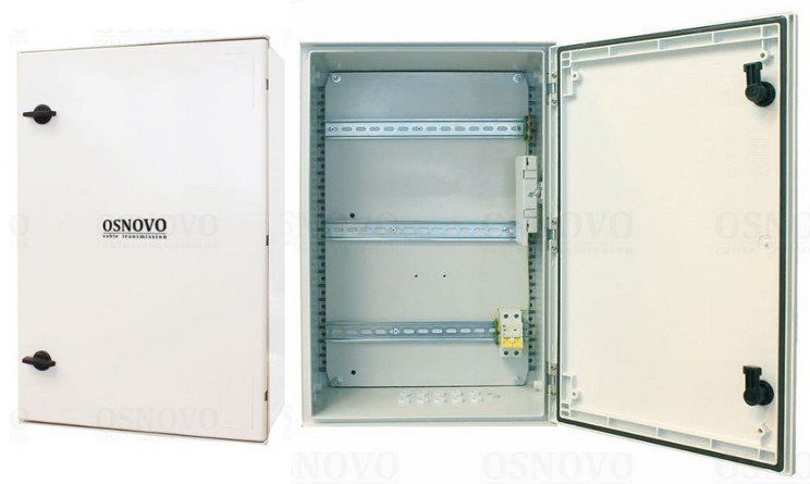 Уличная станция в пластиковом шкафу IP66 с оптическим кроссом. Радиопрозрачная конструкция. Доступное место под установку оборудования на встроенные DIN-рейки: верхняя - 340мм, средняя - 320мм, нижняя - 290мм. -50…+50°С. 400x600x230мм.