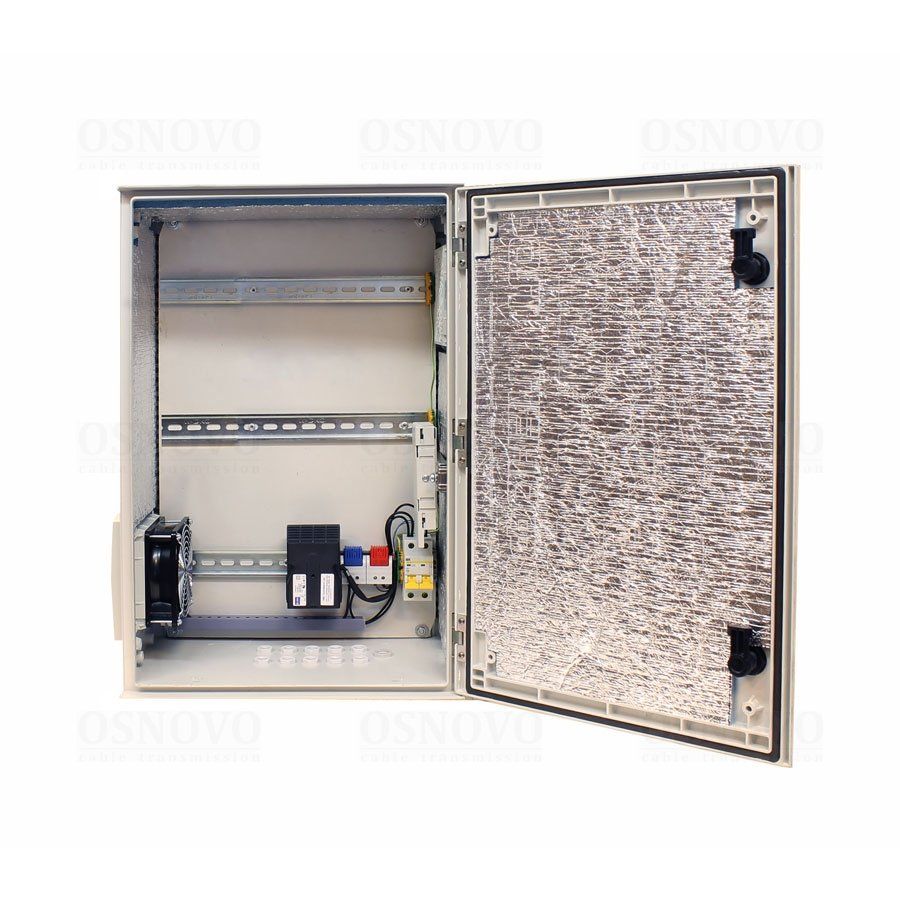 Уличная станция с оптическим кроссом + система обогрева: 2 разъема SC (ложемент 8 КДЗС, пигтейл оптический одномодовый SC 0,9мм длина 1,5м 183x113x22мм); шкаф пластиковый; IP66, встроенные DIN-рейки: верхняя - 300мм, средняя 300мм, нижняя -80мм; набор гермовводов; автоматический выключатель 2P 220 В, 10A; обогреватель на DIN-рейке AC 230 В, 300Вт; -60…+50°С; размеры шкафа 400x600x210 мм. Поддержание температуры внутри шкафа от -0...+55°С (при изменении наружной температуры от -50... +50°С).