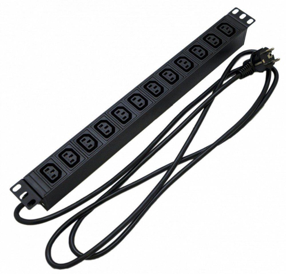 Блок розеток для 19" шкафов, горизонтальный, 12xIEC 320 C13 (10A), 250В, кабель питания 3х1.5мм2, длина 2.5 м, с вилкой Schuko, 482.6x44.4x44.4мм.