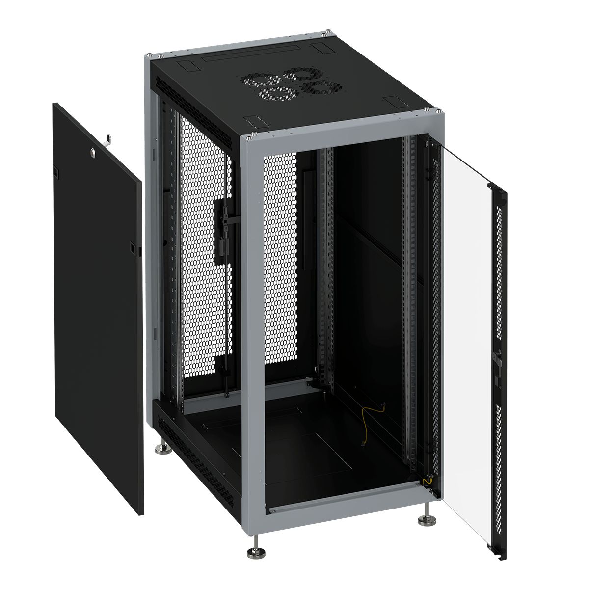 Шкаф телекоммуникационный 19", напольный, 42U, 600x800x2000мм (ШхГхВ), передняя дверь стеклянная, задняя дверь двухстворчатая перфорированная, поворотная ручка с замком, цвет черный (RAL 9004/RAL 7000)