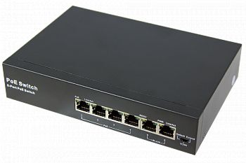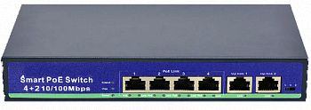Неуправляемый активный 6-портовый PoE-коммутатор, 4 х 10/100 Мб/с PoE RJ45 (порты 1 - 4); 2 х 10/100 Мб/с с Uplink RJ45 (порты 5 - 6), бюджет PoE до 78Вт, мощность на порт 30 Вт (макс.)