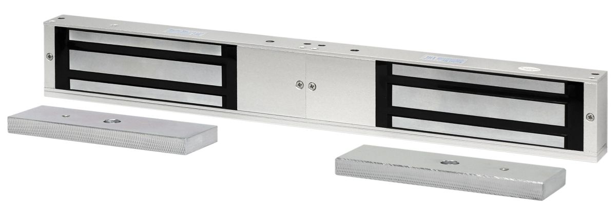 Электромагнитный замок сдвоенный; сила удержания 2х500 кг; датчик Холла (NO/NC/COM); индикация. Питание DC 12В (1А) или 24В (0,5А).