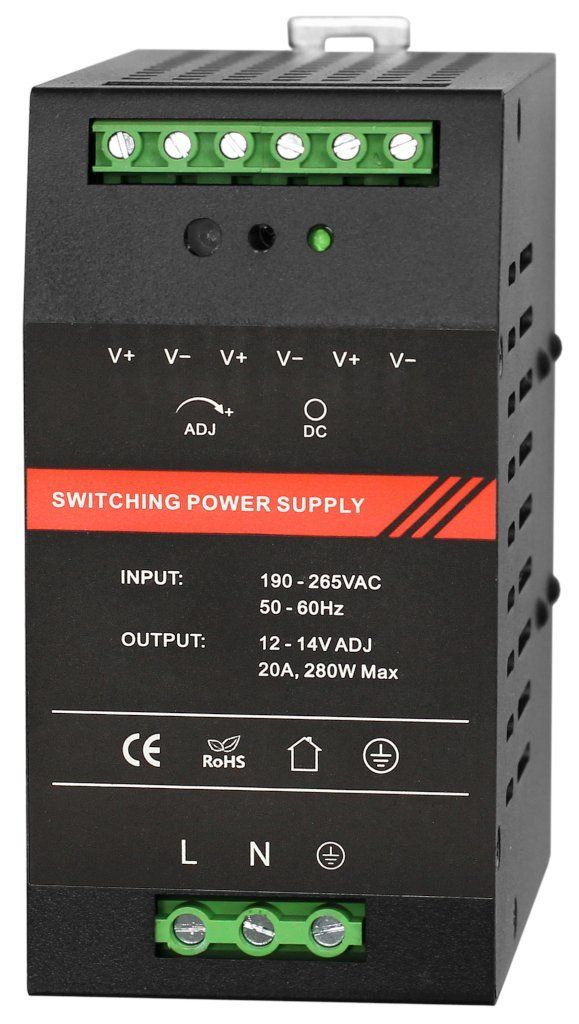 Стабилизированный источник питания с креплением на DIN-рейку; U-вх.190…265 В, U-вых.12…14 В (регулируемое), I-ном.20 А, I-max.22 А; защита от короткого замыкания и перегрузки с автоматическим восстановлением; t-раб.-20…+50°C, 63х124х113 мм. Цвет черный.