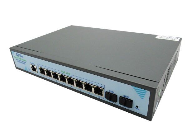 Коммутатор гигабитный 10 портовый управляемый c PoE; 8xRJ-45 PoE 10/100/1000 Мбит/с, IEEE 802.3af/at; 2xSFP Uplink 10/100/1000 Мбит/с; PoE бюджет 120 Вт; передача до 100м.; AC 220В; -10... +55°C; 270х180х44 мм.