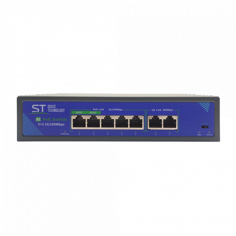 Коммутатор сетевой 7 портовый с РоЕ; 5хRJ45 PoE 10/100 Мбит/с, IEEE 802.3af/at, 2 порта Uplink 10/100 Мбит/с RJ-45; PoE бюджет до 78 Вт, тип РоЕ А; дальность передачи до 250 метров; внутренний БП AC 220В, кабель питания 220В в комплекте; грозозащита, -45... +55°C; 200х118х44 мм.