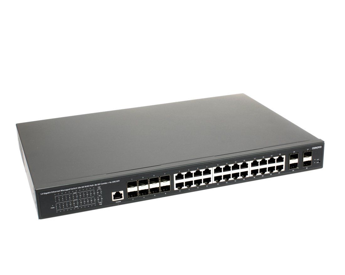 Коммутатор сетевой управляемый L3 28 портовый; 24хRJ45 - 10/100/1000Base-T; 8х SFP 1G Combo; 4х SFP+ 10G; консольный порт; Поддержка Jumbo Frame 16K, IGMP Snooping, VLAN; Встроенная грозозащита 3кВ на порт; Топология: каскад, кольцо; AC 100- 240 В(с возможностью резервирования); 20 Вт;0…+40 С; 440x45x210 мм. Крепеж для 19" стойки в комплекте.