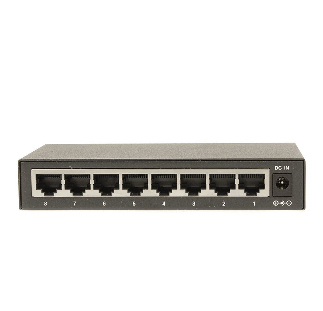 Коммутатор сетевой неуправляемый, 8 портов RJ45 10/100/1000 Мбит/с; Vlan, внешний БП DC 12 В; 1А; грозозащита 3кВ, -10...+55°C; 138x25x80 мм.