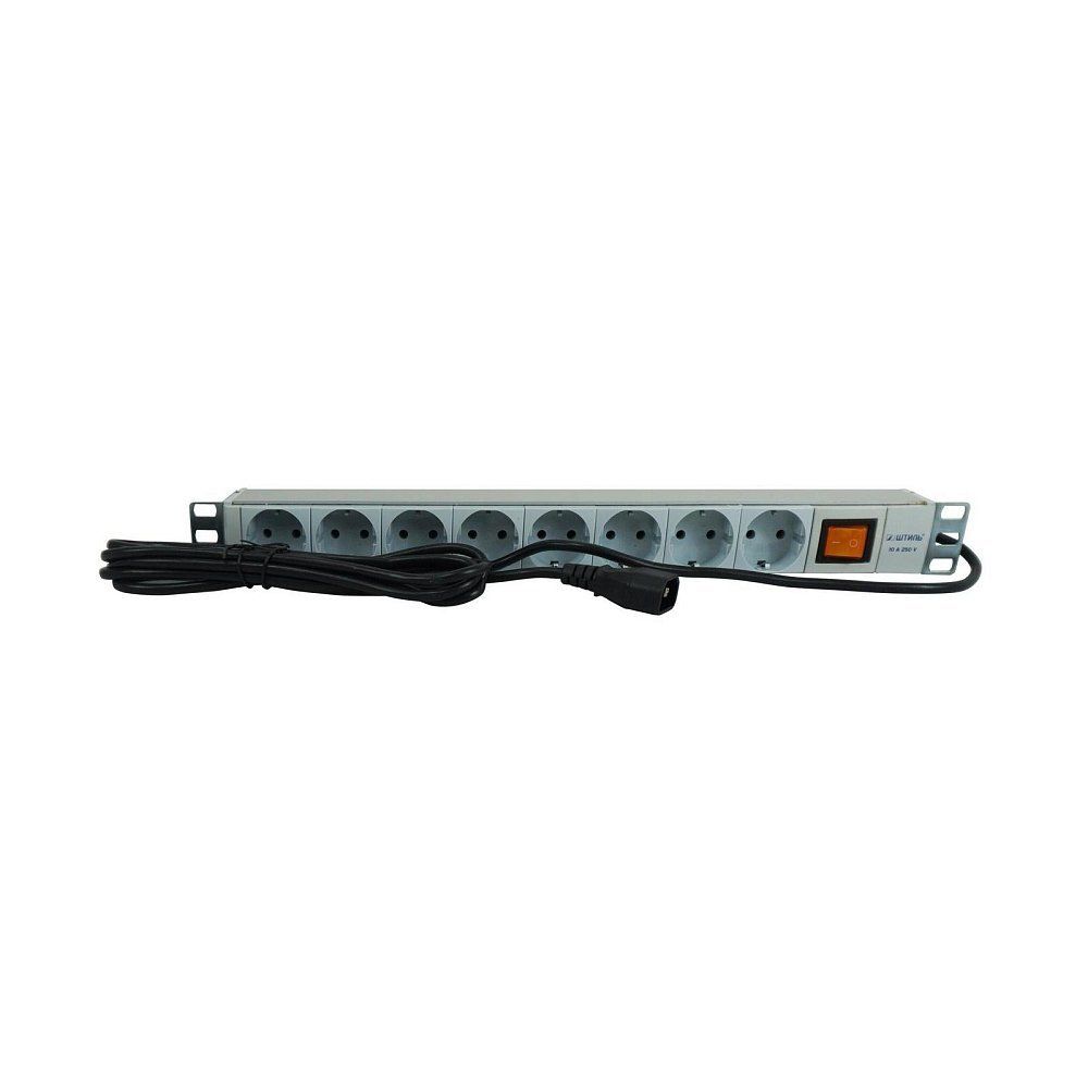 Блок электрических розеток для установки в 19" шкаф с выключателем; высота 1U; 8 розеток (Schuko), кабель 3х1,5 мм², длина кабеля 1.8 м, разъем на кабеле IEC320 C14; U-вх.250 В, I-ном.16 А, 440х44.5х52 мм. Алюминиевый корпус.