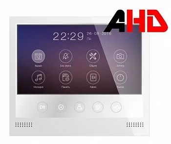 Монитор цветного видеодомофона 7 дюймов с сенсорными кнопками, с поддержкой форматов 1080р/720p/CVBS, разрешение 800х480, hands free, подключение 2-х вызывных панелей, 2-х видеокамер, до 4-х мониторов в параллель. Встроенная память на 100 фото. Запись фото или видео при вызове на microSD карту до 32 ГБ (в комплект не входит). Питание 220В. Размеры: 175х150х14мм (без кронштейна), 175х150х19мм (с кронштейном).