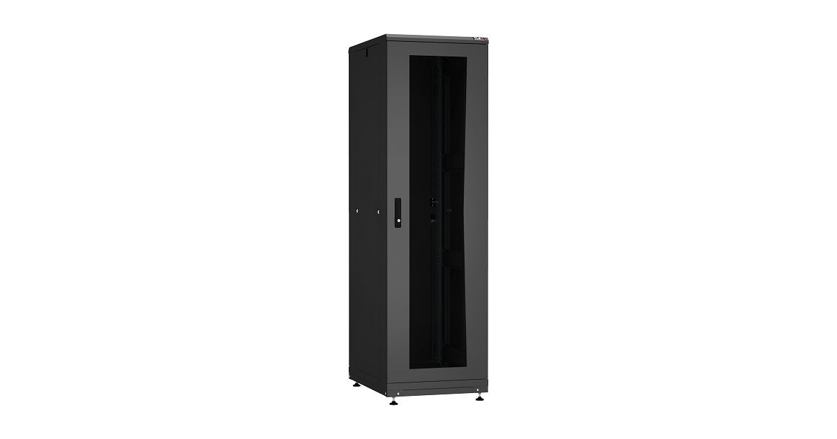 Шкаф телекоммуникационный 19" напольный, 42U, дверь стекло, полезная глубина 740 мм, распределенная нагрузка 800 кг, разборный, цвет черный, 2012х600х800 мм.