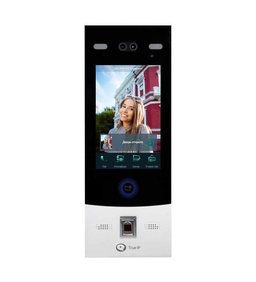 2 MP IP камера; Встроенное распознавание лиц (10 000 лиц); SIP, TCP/IP, RTSP, DTMF, Onvif; цветной сенсорный дисплей 8” 800*1280; 2 режима работы: SIP сервер; клиент для внешнего SIP сервера; LED подсветка; алюминий + ударопрочное стекло; проход по коду, брелку Mifare (10 000), отпечатку пальца (10 000), распознавание лиц (10 000); реле управления замком, подключение кнопки выхода; до 9 999 абонентов; WEB интерфейс; управление второй точкой прохода через реле TI-1SR; вызов на мобильные устройств